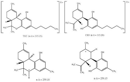 Proposed fragments of Δ9-THC and CBD in ESI positive mode.