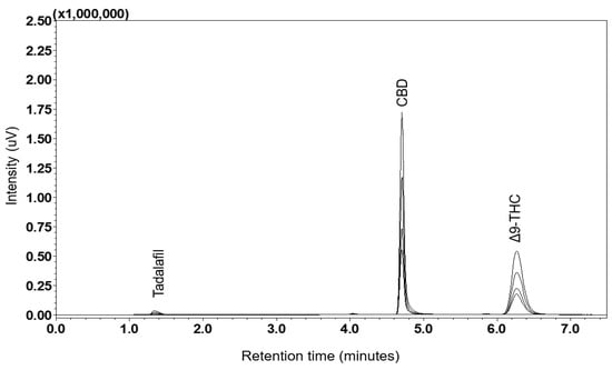 Ultra-high-performance liquid chromatography–tandem mass spectrometry (UHLC-MS/MS) was conducted using the LCMS-8060NX (Shimazu, Kyoto, Japan) and Lab Solution software version 5.99 SP2. The HPLC system comprised an LC-4D XS pump, a CTO-40S column oven, an SIL-40C autosampler, a DGU-405 degasser unit, and an FCV-11AL valve unit, all manufactured by Shimadzu Corporation, Kyoto, Japan. A gradient elution was performed on a Phenomenex Luna C18 column (Torrance, CA, USA) (100 × 2 mm, 3 µm particle size) with a guard column. The mobile phase consisted of two different solutions: 0.01% formic acid in 20mM ammonium formate (solution A) and acetonitrile (solution B). All solutions were degassed and filtered through a 0.22 μm pore size filter. The gradient elution started with initial conditions of 60% eluent B, maintained for 1 min, followed by a linear gradient to 80% from 1.01 to 1.5 min, held for 2.5 min, followed by another linear gradient to 60% from 4.01 to 4.5 min, maintaining this proportion until 7.6 min at a flow rate of 0.4 mL/min. The column temperature was maintained at 40 °C, the autosampler temperature at 15 °C, and the injection volume was 0.1 μL. Tandem mass spectrometry detection was performed using an electrospray ionization (ESI) source in positive ion mode (ESI+) for the detection of Δ9-THC and CBD. Multiple reaction monitoring (MRM) transitions were optimized for the quantification of Δ9-THC and CBD. Tadalafil was used as an internal standard. The analytical method was validated for specificity, linearity, precision, accuracy, and robustness according to AOAC guidelines.