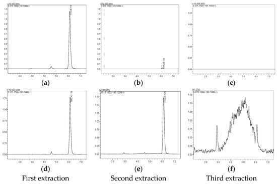 LC-MS/MS chromatograms of the first, second, and third extractions: (a–c) in-house Suk-Saiyasna remedy, (d–f) expanded chromatogram of the in-house Suk-Saiyasna remedy.