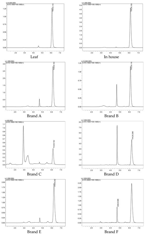 Considerable variation was observed in the chromatograms shown in Figure 9 and in the levels of active compounds among different brands, as illustrated in Table 11 and Table 12. Brands A, B, and E exhibited Δ9-THC concentrations comparable to the in-house standard of approximately 0.09%, with Brand A showing the highest concentration. Conversely, Brand C had the lowest Δ9-THC levels. In terms of CBD content, most brands exceeded the in-house standard of 0.00021%, except for Brand C, which again showed the lowest concentration. Brand B demonstrated the highest CBD content among the samples analyzed. The increasing prevalence of cannabis products in the commercial market has raised concerns regarding the balance of cannabinoids, particularly the ratio of CBD to Δ9 THC. This research explores the implications of higher CBD content in commercial products compared to in-house formulations, focusing on the potential for CBD to mitigate the side effects associated with Δ9-THC. These variations in cannabinoid concentrations highlight the influence of sourcing and manufacturing practices on the quality and efficacy of herbal remedies. Previous studies indicate that the phytochemical profiles of cannabis products can be significantly affected by factors such as cultivation methods, plant genetics, and extraction techniques [40,41].