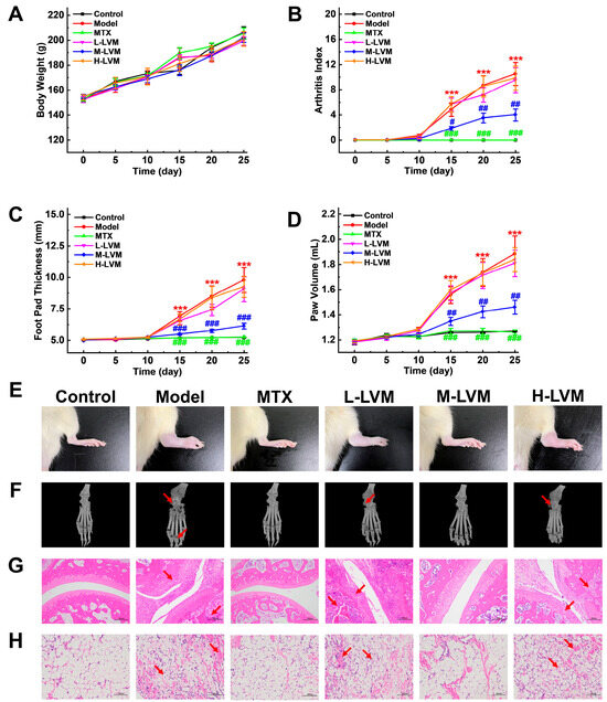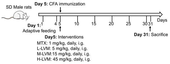 The experimental procedure is illustrated in Figure 8. The AIA rat model was constructed by a single subcutaneous injection at the base of the tail of M. tuberculosis H37Ra suspended in mineral oil (10 mg/mL, 0.1 mL per rat) on day 5 [67]. Rats were divided into the following 6 groups: Control group (subcutaneously injected with saline once and oral gavage administrated with PBS daily, n = 6), Model group (immunized and oral gavage administrated with PBS daily, n = 6), MTX group (immunized and oral gavage administrated with MTX daily, 1 mg/kg, n = 6), L-LVM group (immunized and oral gavage administrated with LVM daily, 5 mg/kg, n = 6), M-LVM group (immunized and oral gavage administrated with LVM daily, 15 mg/kg, n = 6), and H-LVM group (immunized and oral gavage administrated with LVM daily, 45 mg/kg, n = 6). From the first day of modeling, MTX and LVM treatments were initiated, with the entire treatment period lasting 25 days. MTX and LVM were dissolved in PBS.