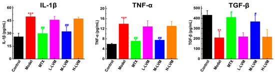 The levels of IL-1β, TNF-α, and TGF-β in the serum were measured by enzyme-linked immunosorbent assay (ELISA). All data are shown as mean ± SEM. ** p < 0.01, *** p < 0.001 when comparing with the Control group using an unpaired Student’s t-test; # p < 0.05, ## p < 0.01 when comparing with the Model group using one-way ANOVA followed by Dunnett’s post hoc test. Definitions of abbreviations for each dosing group: Control, blank control group; Model, model group; MTX, positive drug group; L-LVM, 5 mg/kg LVM group; M-LVM, 15 mg/kg LVM group; H-LVM, 45 mg/kg LVM group. n = 6 in each group.