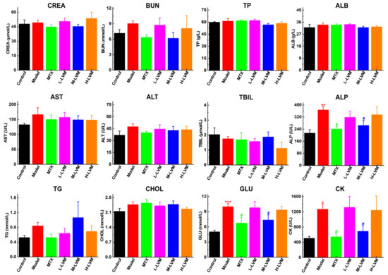 As shown in Figure 4, there were no significant differences observed in indicators closely associated with liver and kidney functions, such as creatinine (CREA), blood urea nitrogen (BUN), total protein (TP), albumin (ALB), aspartate aminotransferase (AST) and alanine aminotransferase (ALT), total bilirubin (TBIL), triglyceride (TG), and cholesterol (CHOL). However, anomalies were detected in the levels of alkaline phosphatase (ALP), creatine kinase (CK), and glucose (GLU). Elevated ALP is associated with impairment in hepatic, renal, and skeletal functions, while increased CK levels suggest the presence of muscle damage or muscular diseases. The findings reveal a modest elevation in ALP levels (p < 0.01) and CK levels (p < 0.05) in the Model group when compared to the Control group. In contrast, both parameters exhibited a decrease in the M-LVM group. Additionally, GLU levels were significantly increased (p < 0.001) in the Model group relative to the Control group, whereas a reduction in GLU levels was noted in both the MTX and M-LVM groups.