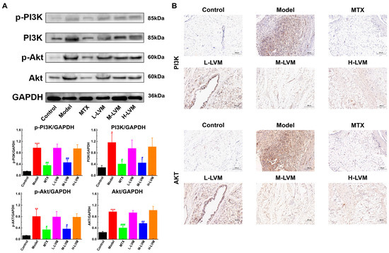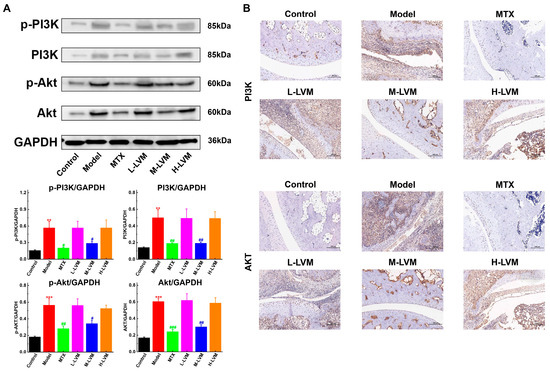 Immunostaining was conducted to detect the expression of the PI3K and Akt proteins in the synovium of rats from different treatment groups, with the PI3K and Akt proteins appearing brown under the microscope (Figure 6B). Compared with the Control group, the synovial tissues of rats in the Model group exhibited a significant distribution of brown particles, along with evident changes in synovial tissue structure. Conversely, treatment with MTX and M-LVM significantly reduced the expression of the PI3K and Akt proteins in comparison to the Model group. In the L-LVM and H-LVM groups, a significant distribution of brown particles in the synovial tissues was observed, with a pathological status similar to that of the Model group.