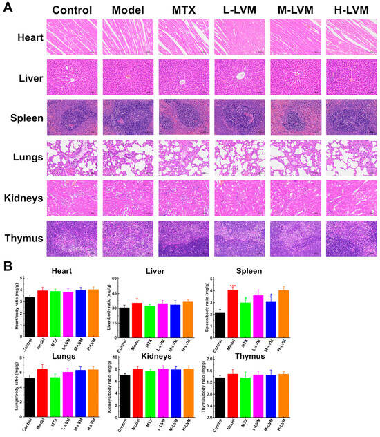 Evaluation of potential adverse effects of LVM in AIA rats. (A) The results of H&E staining (scale bar, 100 μm). (B) Organ coefficient of major organs. All data are shown as mean ± SEM. *** p < 0.001 when comparing with the Control group using an unpaired Student’s t-test; # p < 0.05 when comparing with the Model group using one-way ANOVA followed by Dunnett’s post hoc test. Definitions of abbreviations for each dosing group: Control, blank control group; Model, model group; MTX, positive drug group; L-LVM, 5 mg/kg LVM group; M-LVM, 15 mg/kg LVM group; H-LVM, 45 mg/kg LVM group. n = 6 in each group.