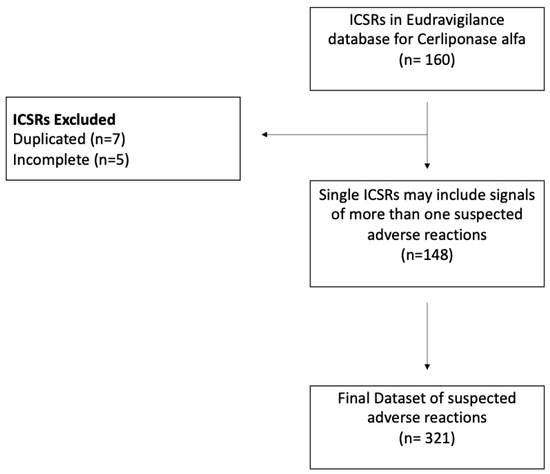 The EudraVigilance database collects spontaneous reported signals for adverse reactions to products licensed for the market. Suspected adverse reactions (SARs) to drugs are described as cases in individual case safety reports (ICSRs). ICSRs contain information on SARs as medical events that have been observed following the use of a medicine, but which have not necessarily been caused by the medicine. Each ICSR may include signals of more than one suspected adverse reaction, and for this reason, the number of cases can be different from the number of events [33]. The EudraVigilance data system contains all ICSRs reported to competent national authorities or marketing authorization holders. For our analysis, we reviewed ICSRs of SARs to cerliponase alfa from 1 June 2017 to 16 October 2023. The public version of the EudraVigilance database (https://www.ema.europa.eu/en/human-regulatory/research-development/pharmacovigilance/eudravigilance; checked on 16 October 2023) was used. ICSRs of SARs were selected on the basis of the Medical Dictionary for Regulatory Activities (MedDRA) (Introductory Guide MedDRA Version 26.0 March 2023. Available online: https://admin.meddra.org/sites/default/files/guidance/file/intguide_26_0_English.pdf; accessed and checked on 16 October 2023). MedDRA contains the standardized international medical terminology used by regulatory agencies and pharmaceutical companies. MedDRA terminology is also used to apply codes to cases with adverse events in clinical study safety reports and databases for pharmacovigilance [34]. Here, adverse reactions were described by using “Preferred Terms” (PTs) listed in MedDRA. A PT is a distinct descriptor (single medical concept) for an adverse symptom or an adverse sign. Two or more PTs with an overlapping clinical meaning were aggregated to avoid not-useful duplicate PTs with the same connotation (for example, the two PTs fever and pyrexia). MedDRA has a hierarchy of terms to describe adverse reactions. Adverse reactions are assembled into the System Organ Class (SOC) terms in the MedDRA hierarchy, such as musculoskeletal and connective tissue disorders, vascular disorders, etc. SOC is the highest level of the hierarchy and denotes the largest concept useful for retrieving data [35]. From each ICSR, data on the patient’s age and sex, the type of adverse event, source, and drugs taken concomitantly were extracted. All ICSRs were related to different patients, while duplicate and incomplete ICSRs were considered as missing data/not reported and excluded from the analysis. Criteria used to collect ICSRs related to cerliponase alfa from EudraVigilance were the following: SARs, complete for age and sex information, indication (according to medical terminology, this is intended here as “reason for use”), and concomitant drugs (Figure 1). A descriptive statistical analysis of data was carried out in the present study using the statistical software SPSS version 29.0 (Chicago Ill., USA). A stratification of signals by group for age and sex was used to reduce bias due to confounding effects caused by these variables. For patient age, the subgroups were 0–1 month, 2 months–2 years, 3–11 years, 12–17 years, 18–64 years, 65–85 years, and ≥85 years, and for patient sex, female and male formed the two subgroups. The ratio between the frequency with which for each case a suspected adverse reaction was signaled once or more than twice between males and females for the years 2017–2023 was calculated by using chi-square as the odds ratio (OR). The OR measures the degree of correlation between sex and the potential for more signals of SARs in single reports (ICSR) for males and females.