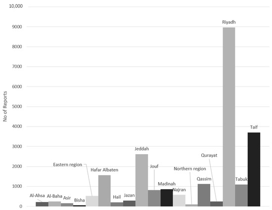 From August 2019 to June 2020, 23,355 ME reports from 18 governmental mental health and psychiatric hospitals in Saudi Arabia were submitted to the MOH database. The highest rate of reported MEs was from Riyadh (n = 8972; 38.42%), followed by Taif (n = 3705; 15.86%), Jeddah (n = 2621; 11.2%), and Hafar Albaten (n = 1565; 6.70) (Figure 1).