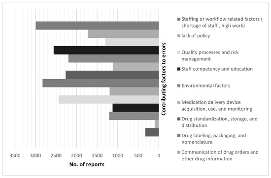 The workload of healthcare staff (n = 2991; 12.81%) drug labeling, packaging, and nomenclature (n = 2826; 12.10%) were the most common contributing factors associated with the reported MEs, followed by healthcare staff competency and education (n = 2557; 10.95%) and patient information (n = 2432; 10.41%) (Figure 2).