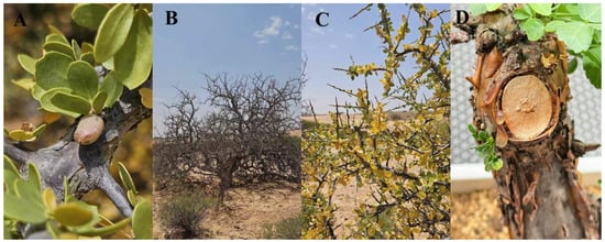 Botanical characterization of Commiphora Myrrha (A) leaves and fruit; (B) leafless, dormant tree; (C) green, leafy tree; (D) stem with thin, papery bark.