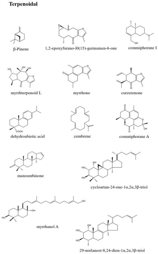 Meanwhile, Wang Yong’s [] research showed that β-caryophyllene, β-elemene, γ-elemene, and other low-oxidation sesquiterpenes accounted for the majority, among which β-elemene accounted for the highest proportion []. Most of these compounds are characterized and identified by GC-MS, influenced by variety, origin, and processing methods, the types and contents of components obtained by different experiments are different. The structure types of diterpenoids are relatively simple and can be divided into abietane/nor-abietane [], cembrenoid type [], podocarpen type [], pimarane type [], and 6/6/6/6 ring neoskeleton type []. The main types of the core structure of triterpenoids isolated from myrrh include oleanane [], ursane [], lanostane [], cycloaltane, etc. Dammarane is the most common []. The terpenoids of various Commiphora genus are listed in Table 3. Some representative chemical structures are shown in Figure 3, while the remaining chemical structures can be found in the Supplementary Materials.