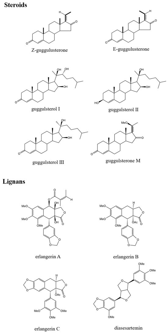 To date, more than 20 steroidal constituents have been isolated from myrrh, with C. mukul being the most abundant. Guggulu is a resin mixture secreted by the tree C. mukul. Patil et al. isolated two steroids from C. mukul, two isomers of Z- and E-guggulsterone []. In recent years, research on the pharmacological activity of guggulsterone has focused primarily on these two compounds. In subsequent studies, Patil isolated a new component, guggulsterols I–III, from the resin []. In the following years, scientists classified substances with similar structures and named them guggulsterols IV–VI [,]. C. Steroid components, namely, guggulsterone-M and guggulsterone-Y, were also isolated from the resin of C. wightii (the circulating species name for C. mukul) []. The steroids of various Commiphora genera are listed in Table 5. Some representative chemical structures are shown in Figure 4.
