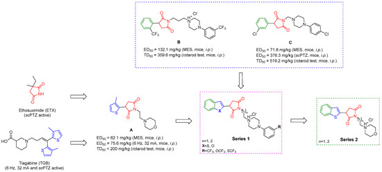 Bearing in mind the complexity and heterogeneity of epilepsy (and pain), one of the most recent discovery paradigms assumes the development of so-called multi-functional compounds as promising candidates for new ASMs [10]. These molecules, specifically with hybrid structures, are usually designed applying a framework combination approach which relies on the integration of at least two pharmacophores on one chemical scaffold [11]. Therefore, applying the aforementioned approach, we have obtained in recent years plenty of structurally diversified pyrrolidine-2,5-dione derivatives with a hybrid structure which integrate fragments of well-known ASMs such as ethosuximide (ETX), lacosamide (LCS), or levetiracetam (LEV). Consequently, in vivo evaluations showed that some of these compounds revealed potent and broad-spectrum anticonvulsant activity in the ‘classical’ animal models of seizures, i.e., the maximal electroshock (MES) test, the 6-Hz psychomotor seizure model (at current intensity of 32 mA), and/or the subcutaneous pentylenetetrazol (scPTZ) test [12,13,14,15,16]. One of the most recent chemical groups explored by our team was focused on compounds containing the methyl-thiophene moiety which is a key structural element for the clinically relevant ASM tiagabine (Figure 1). In this series, the most promising antiseizure properties revealed compound A (published as 4 in ref. [12]), which effectively protected mice in the MES (ED50 of 62.1 mg/kg) and 6 Hz (ED50 of 75.6 mg/kg) seizure models. Therefore, with an aim of further investigating the influence of the thiophene (marked in blue in Figure 1) ring and its derivatives on antiseizure efficacy, we decided herein to obtain a new and target library of eight pyrrolidine-2,5-diones (marked in red in Figure 1) containing at position-3 the benzo[b]thiophen-2-yl moiety or its oxygen bioisostere. Additionally, the molecules synthesized herein share structural similarities to potent anticonvulsants identified in a group of N-[(4-arylpiperazin-1-yl)-alkyl]-3-phenyl-pyrrolidine-2,5-diones represented by compounds B, C (published as compounds 11i and 16, respectively, in ref. [17,18]). It should be noted that the substitution mode of the phenylpiperazine moiety was restricted only to groups that are favorable to antiseizure activity as identified in the previous studies, i.e., CF3, OCF3, and SCF3 [13,14,16]. This approach allowed for the reduction of the number of animals used in the in vivo experiments.