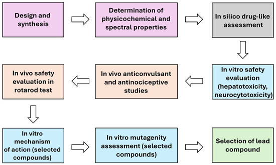 The anticonvulsant activity of the new derivatives was assessed in acute models of seizures, namely using the MES, 6 Hz (with 32 and 44 mA stimulus intensity), and scPTZ tests. The antinociceptive properties were estimated in the formalin model of tonic pain as well as in the oxaliplatin-induced neuropathic pain model in mice. Considering drug safety evaluation, which is important during the preclinical characterization of new bioactive substances, the acute neurological toxicity was determined in the rotarod test. Moreover, hepatocytotoxicity and neurocytotoxicity using in vitro cellular models was examined for all compounds prior to in vivo testing. The safety in vitro panel was also extended to the assessment of the mutagenic properties of the most potent antiseizure medications. Finally, for the most potent compounds, in vitro mechanistic studies were performed to establish the plausible mechanism of action underlying their anticonvulsant and antinociceptive properties (for better clarity, the workflow of this project has been presented in Figure 2).