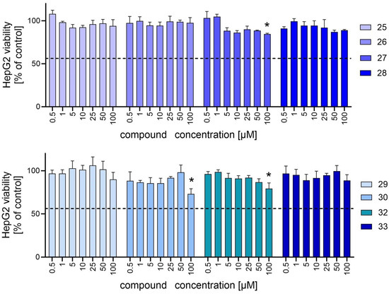 Compounds 25–30, 32, and 33 do not demonstrate hepatocytotoxicity in vitro. HepG2 cells were exposed to growing concentrations (0.5–100 µM) of tested compounds for 24 h. Cell viability was measured by MTT assay. Bars represents mean percent of cells viability normalized to non-treated cells (100%) ± SEM. Dashed line indicates toxicity of doxorubicin, applied at 10 µM. * p < 0.05.