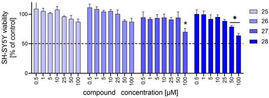 Compounds 25–30, 32, and 33 do not demonstrate neurocytotoxicity in vitro. SH-SY5Y cells were exposed to growing concentrations (0.5–100 µM) of tested compounds for 24 h. Cell viability was measured by MTT assay. Bars represents mean percent of cells viability normalized to non-treated cells (100%) ± SEM. Dashed line indicates toxicity of doxorubicin, applied at 10 µM. * p < 0.05.