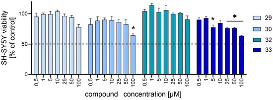 To evaluate selected compounds’ hepatocytotoxicity and neurocytotoxicity, a human hepatocellular carcinoma cell line, HepG2 (ATCC® HB-8065™, Sigma-Aldrich, St. Louis, MO, USA), and a human neuroblastoma cell line, SH-SY5Y (ATCC®, CRL-2266™, Sigma-Aldrich, St. Louis, MO, USA), were used. Both cell lines were cultured in standard culture conditions (5% CO2, 37 °C, 95% humidity) using Dulbecco′s Modified Eagle′s Medium (DMEM; Gibco, Thermo Scientific, Waltham, MA, USA) supplemented with 10% (vol/vol) fetal bovine serum (FBS; Gibco, Thermo Scientific, Waltham, MA, USA) and antibiotics mixture (Penicillin, Streptomycin, Amphotericin B; Gibco, Thermo Scientific, Waltham, MA, USA). Cells were cultured with 25–30, 32, or 33 (0.5–100 µM) for 24 h and then an MTT (3-(4,5-dimethylthiazol-2-yl)-2,5diphenyltetrazolium bromide, Sigma-Aldrich, St. Louis, MO, USA) viability assay was performed. The formazan crystals were dissolved in DMSO (Sigma-Aldrich, St. Louis, MO, USA), and the absorbance at 570 nm was measured using a microplate reader (SpectraMax® iD3, Molecular Devices, San Jose, CA, USA). The experiment was performed three times in duplicate. Each bar represents mean (±SEM) percentage of viable cells in comparison to control (defined as 100% and represented untreated cells).