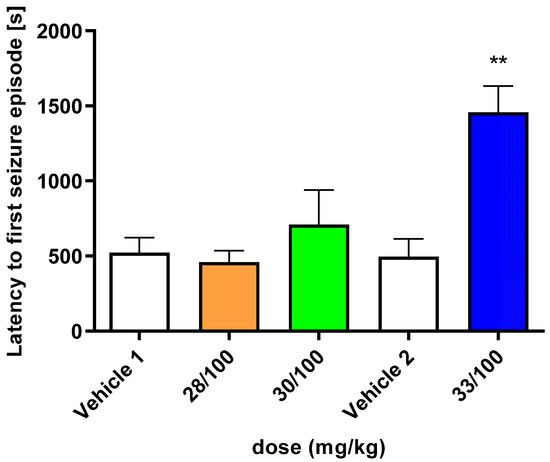 In the next phase of the antiseizure activity studies, compounds 28, 30, and 33 were selected for further investigation due to their potent protection in the MES and 6 Hz models as well as their favorable protective index. Thus, they were examined via chemically induced seizures by subcutaneous (s.c.) administration of pentylenetetrazole (PTZ)in an scPTZ test, which is a model of absence and myoclonic seizures. PTZ is a convulsant substance which antagonizes the inhibitory function of GABA by binding to the picrotoxin-binding site of the postsynaptic GABAA receptor [24]. In this test, 33 significantly prolonged the latency time to the first seizure episode compared to the vehicle group by 196%, p < 0.01 (control group: 496.2 ± 117.3 s; 33: 1470 ± 270.4 s) t = 4.539, df = 10. On the other hand, compounds 28 and 30 were inactive in this test (Figure 5).