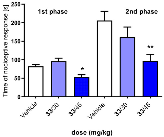 As shown in Figure 6, compound 33, at the dose of 45 mg/kg, significantly reduced the time of the nociceptive response in both phases I (neurogenic—early phase) and II (inflammatory—second phase) of the formalin test by 34% (p < 0.05) F (2, 21) = 10.64 and by 53.3% (p < 0.01) F (2, 21) = 5.233, respectively. At the lower dose of 30 mg/kg, it did not significantly affect the time of the pain reaction, neither in the early nor in the second phase of the test.
