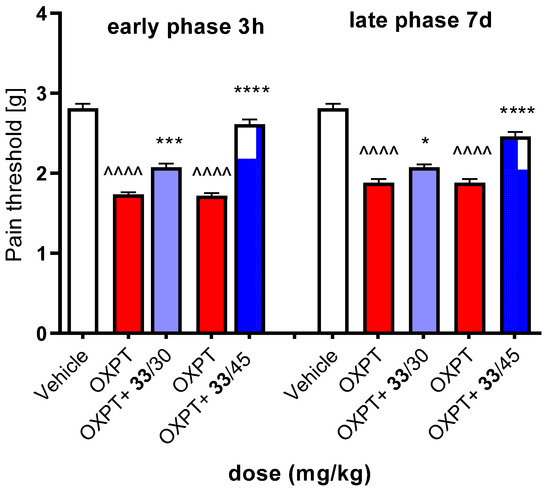As shown in Figure 7, in the early phase of the test, compound 33 at doses of 30 mg/kg and 45 mg/kg elevated the pain threshold by 19.6% (p < 0.001) F (2, 27) = 152.5 and by 51.9% (p < 0.0001) F (2, 27) = 126.3, respectively. Seven days after the administration of the oxaliplatin, in the late phase of the test, a reduction of allodynia by 10% (p < 0.05) F (2, 27) = 109.3 and by 30.7% (p < 0.0001) F (2, 27) = 76.64 was observed for 33 at doses of 30 mg/kg and 45 mg/kg, respectively.