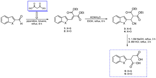 A solution of either benzo[b]thiophene-2-carboxaldehyde (15 g, 92.47 mmol, 1 eq) or 2-benzofurancarboxaldehyde (13.51 g, 92.47 mmol, 1 eq) in AcOH (3 mL), piperidine (3 mL) and toluene (80 mL) was treated dropwise with diethyl malonate (18.96 g, 118.36 mmol, 1.28 eq). After stirring in reflux for about 8 h, the mixtures were cooled and concentrated under reduced pressure. The residues were dissolved in DCM (80 mL) and extracted with saturated NaHCO3 (3 × 50 mL), 1M HCl (3 × 50 mL), and water (3 × 50 mL). The organic layers were dried with anhydrous Na2SO4 and the solvents were evaporated in vacuum. Diethyl malonate derivatives 1 and 2 were obtained as yellow solids.