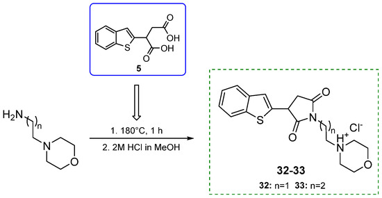 Due to the high antiseizure activity of the morpholine derivatives described by our team previously [12], as well as the aim for a more detailed structure–activity relationship analysis, we decided also to obtain Series 2 of the compounds (32, 33), containing the morpholine ring instead of the phenylpiperazine moiety which appeared in Series 1. Therefore, 32 and 33 were obtained in a two-step procedure involving the condensation of commercially available aminoalkylmorpholine derivatives with dicarboxylic acid 5 and the conversion of crude products into water-soluble hydrochloride salts (32, 33), by using the 2M hydrochloric acid solution in methanol. The synthetic procedure is shown in Scheme 3.