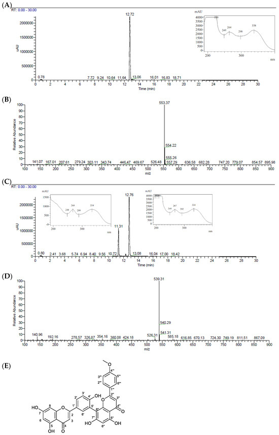 In the F5 chromatogram, only one peak was observed with tR 12.72 min and a protonated molecule of m/z 553 [M+H]+, corresponding to C31H20O10 (Figure 1A,B). In the F6 chromatogram, two peaks were observed, the first with tR 11.31 min and a protonated molecule of m/z 539 [M+H]+, corresponding to C30H18O10 (Figure 1C,D), probably corresponding to amentoflavone. The second peak with tR 12.76 min was identified as the same flavonoid of F5 after comparing UV spectra and the MS fragmentation patterns. The compound isolated in F5 was further characterized by NMR spectroscopy as the biflavone podocarpusflavone A (PCFA) (Figure 1E), in accordance with the literature [19]. 1H and 13C NMR spectra are presented in the Supplementary Material Figure S1.