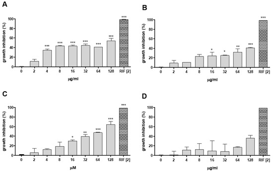 During the mid-logarithmic growth phase, bacterial suspensions were plated in a 96-well microplate at 1 × 106 CFU/well. The samples were added at 128, 64, 32, and 16 μg/mL or μM (for PCFA), along with rifampicin at concentrations ranging from 0.0032 to 4 μg/mL. The plates were sealed and incubated at 32 °C or 37 °C for M. marinum and M. tuberculosis, respectively, and 5% CO2 for 5 days. After these periods, the M. tuberculosis cultures were incubated for 3 h with MTT solution (5 mg/mL) and then treated with lysis buffer (20% w/v SDS/50% dimethylformamide—DMF in distilled water, pH 4.7) for 18 h. The optical density was measured at 570 nm [51]. The M. marinum fluorescent cultures were analyzed by fluorescence using 588 nm excitation and 610 nm emission for the E11 strain, and 493 nm excitation and 509 nm emission for the Wasabi strain. Mycobacteria treated and untreated with rifampicin were used as positive and negative controls, respectively.