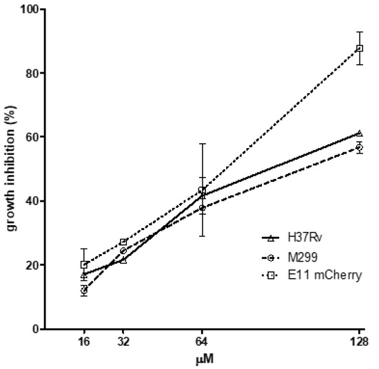 Growth inhibition of Mycobacterium strains by podocarpusflavone A (PCFA). Microplate assay after 5 days of incubation in the presence of PCFA (16–128 µM). Growth of Mycobacterium tuberculosis strains H37Rv and M299 was evaluated by the MTT test. The growth of M. marinum E11 mCherry red-fluorescent bacteria was assessed by measuring bacterial fluorescence (excitation at 588 nm and emission at 610 nm). The untreated Mycobacterium strains were used as a negative control, and rifampicin (RIF) was used as a positive control, with MIC values for each of the strains equal to 0.3 µg/mL for M299; 1 µg/mL for H37Rv and 4 µg/mL for E11 mCherry, respectively.