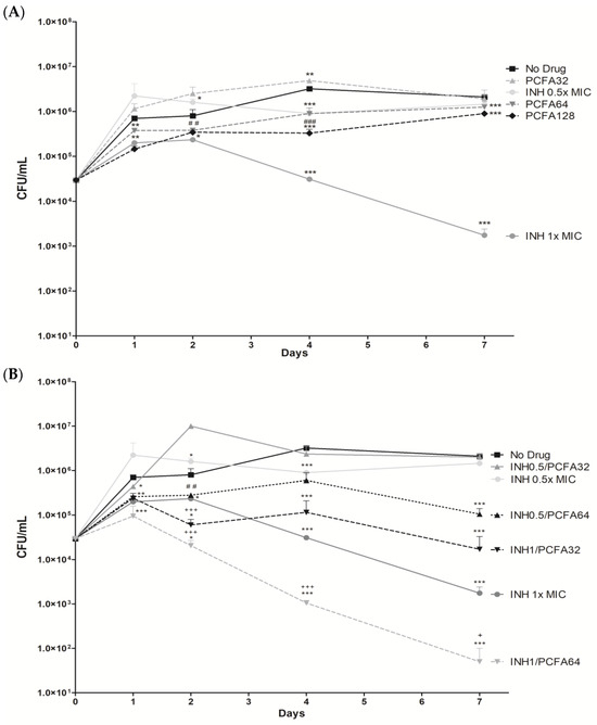 The ability of PCFA, or isoniazid either on its own or in combination therapy with (INH), to inhibit the intracellular growth of mycobacteria was tested in THP-1-derived macrophages infected with M. tuberculosis H37Rv strain (Figure 4). This in vitro-infected macrophage model allows researchers to mimic the environment typically encountered by mycobacteria during infection [29]. The results demonstrated that PCFA alone at 64 and 128 µM was able to reduce bacterial growth when compared to untreated bacteria, as well as when compared to INH 0.5× MIC (0.032 µg/mL) at days 2 and 4 (Figure 4A). PCFA also reduced mycobacterial growth in combination with INH: INH 0.5× MIC + PCFA 64 µM was more efficient than INH 0.5× MIC alone. Likewise, INH 1× MIC + PCFA 32 µM and INH 1× MIC + PCFA 64 µM were more efficient than INH 1× MIC alone (0.063 µg/mL) (Figure 4B). Interestingly, the inhibitory effect was increased with the combined INH 1× MIC+ PCFA 64 µM, resulting in statistical significance on days 2, 4, and 7 (Figure 4B). Moreover, on days 4 and 7, the observed effect for the combination INH 1× MIC + PCFA 64 µM (Figure 4B) was higher than the sum of the single effects of INH 1× and PCFA 64 µM (Figure 4A). No significant toxicity was observed for PCFA on non-infected THP-1 macrophage culture, while it exhibited selectivity against the M. tuberculosis H37Rv strain. These findings indicate that further studies should be conducted to better characterize PCFA as a combination drug regarding novel combination regimens for TB treatment. In these multidrug regimens, a companion drug is used to prevent treatment failure due to acquired resistance to the core drugs. Some also help to reduce the risk of relapse [30].