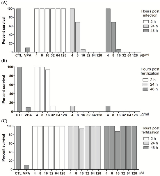 Viability of zebrafish larvae treated with Kielmeyera membranacea samples. The wild-type zebrafish larvae were treated with ethanolic extract (EE) (A), dichloromethane fraction (DCM) (B), and PCFA (C) for 2, 24, and 48 hpf, and viability was evaluated by microscopy-based morphological analysis. CTL (negative control, dilution water) and VPA (positive control, valproic acid—15 μM).