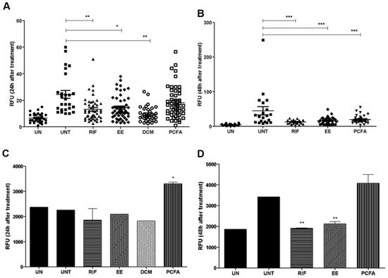 Effect of treatment with the ethanolic extract (EE), dichloromethane fraction (DCM) (32 µg/mL), and podocarpusflavone A (PCFA) (32 µM) on mycobacterial growth (mCherry E11) in 4- and 5-day-old Tg(mpeg1:eGFP)gl22 larvae after yolk sac injection of Mycobacterium marinum. (A) Red-fluorescent mycobacteria measured by COPAS analysis after 24 h, and (B) 48 h. (C) Green-fluorescent macrophages were measured by COPAS analysis after 24 h and (D) 48 h. UN: uninfected; UNT: untreated; RIF: rifampicin. *** p < 0.001 ** p < 0.01 and * p < 0.05 when compared to the infected and untreated group (UNT).