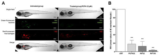 Caudal vein injection of Mycobacterium marinum and effect of treatment on infected larvae. Fluorescence microscopy images of fluorescent zebrafish and M. marinum. (A) Transgenic zebrafish larva with red fluorescent macrophages Tg(mpeg1:mCherry)gl23 infected with green fluorescent M. marinum (Wasabi), untreated or treated with PCFA (podocarpusflavone A) at 32 µM after 3 days. (B) Mean values of relative fluorescence units of green-fluorescent bacteria after 3 days with PCFA (32 µM) and rifampicin (RIF) (32 and 100 µM) treatment. Scale bar: 250 µm. *** p < 0.001 compared to the infected and untreated group (UNT).