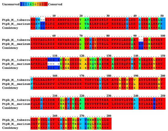Amino acid sequence alignment of PtpB of Mycobacterium tuberculosis and M. marinum, * refers to the same amino acid residues in protein alignment, showing the consistency of the results. Image from the server Praline (https://www.ibi.vu.nl/programs/pralinewww/) accessed on 29 October 2024.