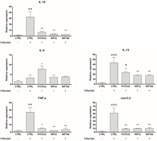 Expression levels of cytokines and macrophage markers in zebrafish larvae infected with Mycobacterium marinum determined by RT-qPCR. The Tg(mpeg1:mCherry)gl23 zebrafish larvae, infected (+) or non-infected (−) with M. marinum, were treated with podocarpusflavone A at 32 µM (PCFA32), rifampicin at 32 or 100 µM (RIF32 and RIF100) or were left untreated (CTRL) for 5 days, and relative expression of mRNA was measured for IL-12, IL-6, TNF-α, IL-10, and CXCR3.2. The expression of each target gene was related to the expression of the housekeeping ppial gene. The data were expressed as the mean ± SEM. * p < 0.05 and ** p < 0.01 compared to the CTRL infected group and # p < 0.05, ## p < 0.01 and ### p < 0.001 as compared to the CTRL non-infected group.