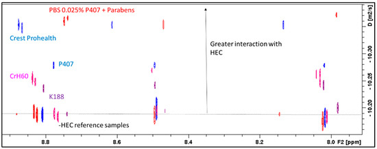 As discussed in the introduction, the DRA is used to determine the availability of CPC in a given formulation based on an affinity to a cellulose disk. It was hypothesised that based on the sensitivity of CPC diffusion to formulation composition, it would be possible to substitute this assay with a partially water-soluble cellulose mimic [26,27]. Hydroxyethyl cellulose (HEC) was selected as the proxy for the DRA, and DOSY NMR data for CPC in the presence and absence of HEC w evaluated (Figure 5).