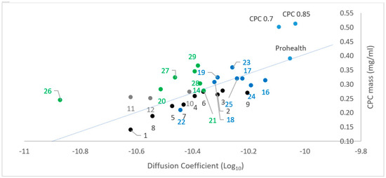 Hence, the CPC diffusion values in the absence of HEC were considered alone, in terms of antimicrobial activity (Figure 10), which showed a solid correlation with a few outliers where the concentration of [CPC]f was higher, further endorsing the premise that a combination of factors can increase or decrease the CPC activity.