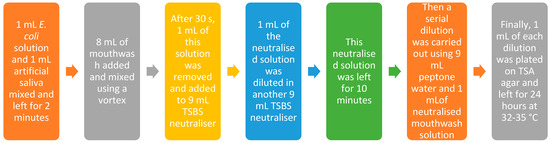 Amounts of 1 mL E. coli solution and 1 mL artificial saliva were added together and left for 2 min before adding 8 mL of mouthwash solution, mixing and removing 1 mL after 30 s. This was added to 9 mL TSBS (tryptic soy bath solution) neutraliser and mixed, and then 1 mL of this was added to the next 9 mL of TSBS and mixed. After ten minutes, the serial dilution was carried out with 1 mL from the second neutralised solution being added to the peptone diluent, mixed and repeated for 3 dilutions. Then 1 mL of each dilution (−5, −4, −3, −2) was plated up with TSA agar on two plates for each dilution. The agar was mixed gently and left to set before placing in an incubator for 24 h at 32–35 °C. After 24 h, the colonies on the plates were counted and results calculated. Log10 antimicrobial activity is Log10 of the number of bacteria killed after the above process.