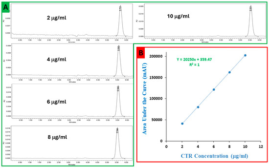 (A) Chromatograms of calibration standards of CTR in different concentrations (2, 4, 6, 8 and 10 μg/mL); and (B) the constructed calibration curve between area under the curve (AUC) of the peak (mAU) and CTR concentration (μg/mL).