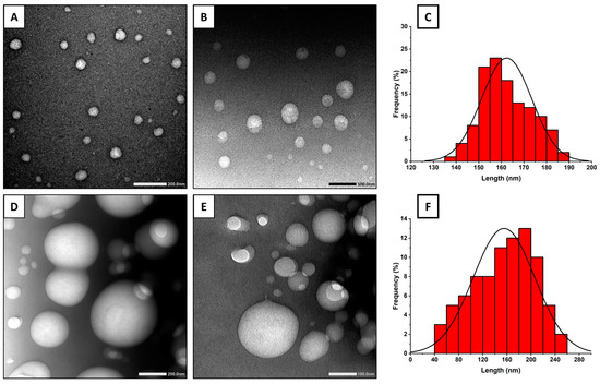 (A,B) Transmission electron micrographs of CTR-niosomes; (C) histogram representing size distribution of CTR-niosome in diameter frequency (%); (D,E) CTR-bilosomes; and (F) histogram representing size distribution of CTR-bilosome in diameter frequency (%).