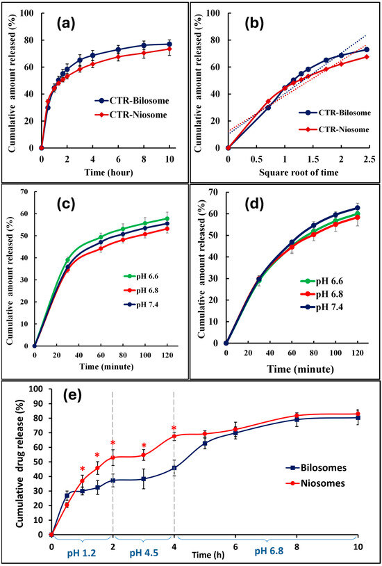 Release profiles of cytarabine from (a) CTR-niosomes and CTR-bilosomes at pH 6.8 for 10 h; (b) Fitting of release profiles of the tested niosomes and bilosomes at pH 6.8 with Higuchi release kinetic model; (c) the CTR-niosomes at different intestinal pH, including 6.6, 6.8, and 7.4 for 2 h; (d) CTR-bilosomes at different intestinal pH, including 6.6, 6.8, and 7.4 for 2 h; and (e) CTR-niosomes and CTR-bilosomes at continuous pH variation medium for 10 h. * Amounts of CTR release from niosomes are significantly higher than that recorded from bilosomes at corresponding time points.