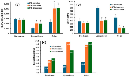 Bar charts of (a) absorptive clearance; (b) L95%; and (c) percent of paracellular pathway in intestinal absorption of CTR passing different segments of GIT in the form of CTR solution (blue), niosomes (CTR-niosomes) (orange), and bilosomes (CTR-bilosomes) (green). Values are expressed in mean ± SD (n = 4). * Significantly different compared to the corresponding CTR solution. p < 0.05 is considered significant.