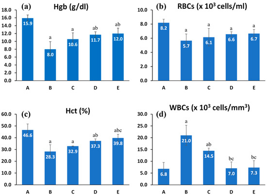 Comparative effect of CTR solution (group C), CTR-niosomes (group D), and CTR-bilosomes (group E) on (a) hemoglobin (Hgb); (b) red blood cell counts (RBCs); (c) hematocrit (Hct); and (d) white blood cell counts (WBCs). All graphs are compared to the healthy group (group A) and the diseased untreated group (group B). Values are expressed in mean ± SD (n = 5). p < 0.05 is considered significant. a: significant compared to group A. b: significant compared to group B. c: significant compared to group C.