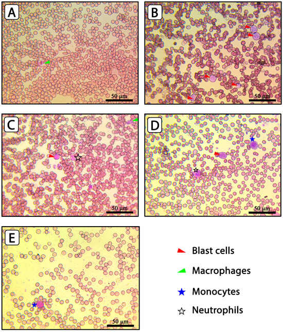 At the same time, a fresh drop was collected from the tube and spread over a microscopic slide, making a thin blood film freshly dehydrated by methanol, stained by Leishman stain for 20 min, and finally rinsed with phosphate-buffered saline (PBS). Blood film from each group was examined under the microscope for blast cells [68].