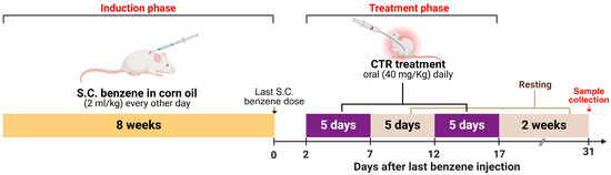 Acute myeloid leukemia (AML) was induced utilizing the benzene-induced leukemia model. This was achieved by subcutaneous injection of benzene (2 mL/kg) diluted in corn oil (1:1 v/v dilution), which was injected every other day for 8 weeks [68,69]. Once the induction was obtained (based on the blood picture), the treatment protocol was started two days after the last subcutaneous benzene dose (Figure 7).