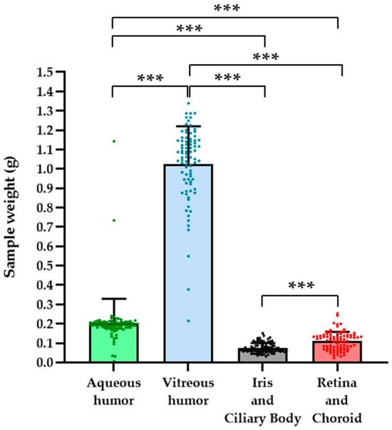 Sample weights. Bar graphs illustrate the mean total sample weight measurements for each eye component studied, independently of eye laterality or treatment received. The green bar represents samples from the aqueous humor, the blue bar represents samples from the vitreous humor, the black bar represents samples from the iris/ciliary body, and the red bar represents samples from the retina/choroid. Individual values are indicated by circle symbols. n = 84. *** p < 0.001.