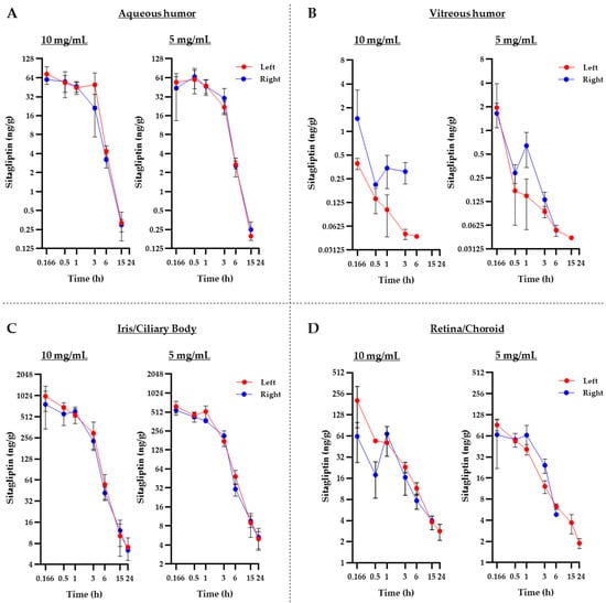 Individual pharmacokinetic analysis of sitagliptin concentrations among the different ocular tissues. (A–D) Temporary profiles of sitagliptin concentrations in the aqueous humor (A), vitreous humor (B), iris/ciliary body (C), and retina/choroid (D) for each dose and eye. A total n of 21 rabbits (3 at each time of extraction) was used for each eye. Symbols illustrate the mean value of the 3 animals at each extraction time, while the error bars represent the standard deviation. The concentration and time axes are presented in a logarithmic base-2 scale format.