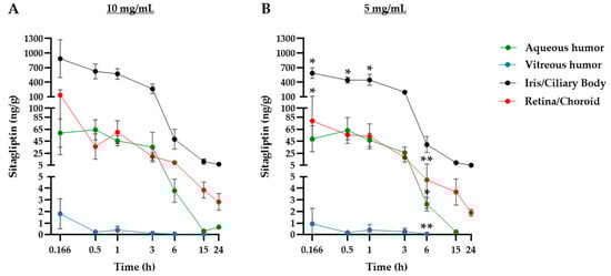 Comparison of sitagliptin pharmacokinetic profiles between the four eye matrices studied. (A,B) Sitagliptin measurements (ng/g tissue) in the four studied parts of the eye during the experimental course of rabbits treated with sitagliptin 10 mg/mL (A) or sitagliptin 5 mg/mL (B). The pharmacokinetic profile of the aqueous humor (green circles), vitreous humor (blue circles), iris/ciliary body (black circles), and retina/choroid (red circles). A total n of 21 rabbits (3 at each time of extraction) was used per experimental group. The symbols represent the mean of the 3 animals for each extraction time, while the error bars represent the standard deviation. The concentration and time axes are presented in a logarithmic base-2 scale format. The X axis (time) is presented in a logarithmic base-2 scale format. A statistical analysis was conducted to compare the different concentrations, with the time points displaying significant differences highlighted in the graph on the right (5 mg/mL). * p < 0.05, ** p < 0.01.