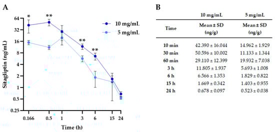 Pharmacokinetic profile of sitagliptin bloodstream levels for both tested concentrations. (A) Blood sitagliptin measurements (ng/mL) during the experimental course of rabbits treated with sitagliptin 10 mg/mL (dark blue circles) or sitagliptin 5 mg/mL (light blue circles). A total n of 21 rabbits (3 at each time of extraction) was used per experimental group. The symbols represent the mean of the 3 animals for each extraction time, while the error bars represent the standard deviation (SD). The concentration and time axes are presented in a logarithmic base-2 scale format. (B) Table exhibiting sitagliptin bloodstream concentrations for both groups during the experimental course. Concentrations are expressed as the mean ± SD of 3 animals at each extraction time. n = 21; * p < 0.05, ** p < 0.01.