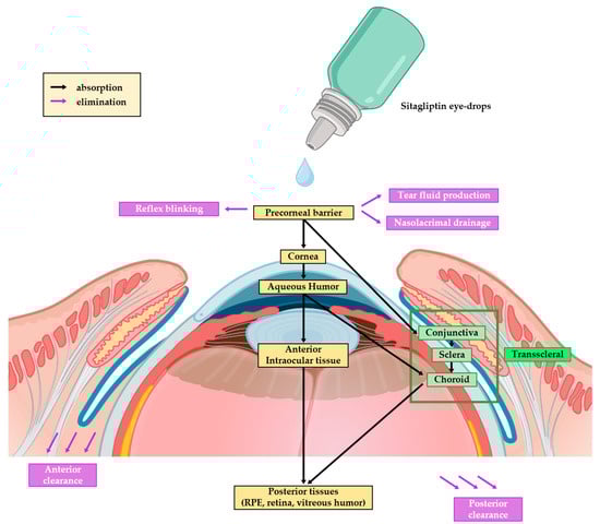 Scheme showing the transscleral route of sitagliptin eye drops’ absorption. After eye drops are applied and distributed across the tear film, the drug is absorbed through the conjunctiva and then penetrates the sclera via diffusion. Certain factors, such as molecular size and lipophilicity, influence this process, with smaller, lipophilic molecules penetrating more easily. Once through the sclera, the drug reaches the choroid and, subsequently, the retina, where it exerts therapeutic effects.