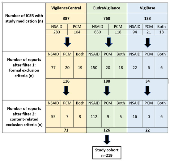 Flow chart of the selection process for generating the final study cohort. Filter 1 and filter 2 criteria are listed in detail in Table S1. ICSR, Individual Case Safety Report; n, number of cases; Both, co-exposed to NSAID/PCM; NSAID, non-steroidal anti-inflammatory drug; PCM, paracetamol.
